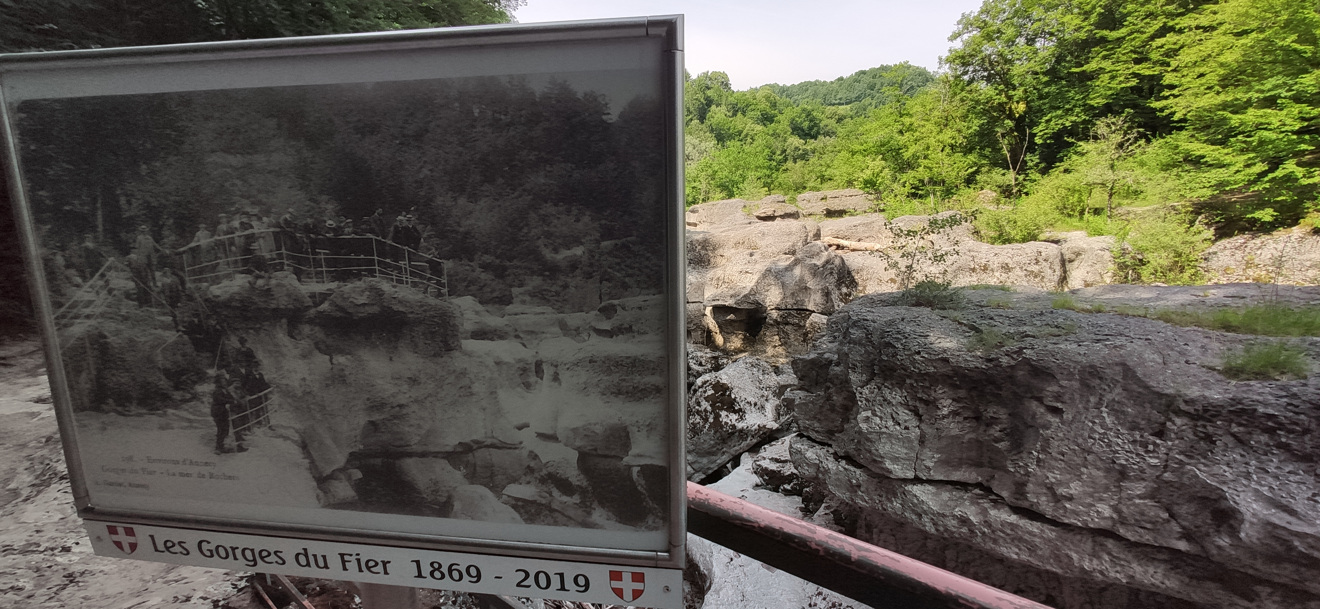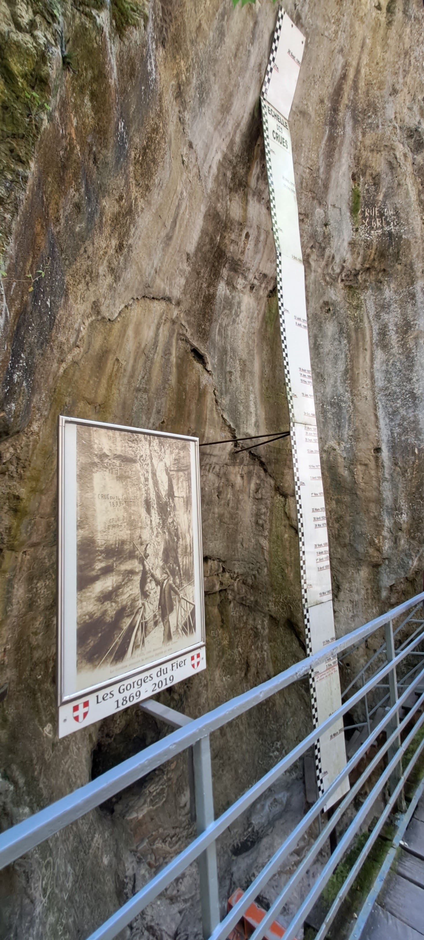 Impressionnant de voir le niveau de l’eau actuel (fin août) et la différence avec les crues et les niveaux des années 1900! Le parcours est accessible et facile, un bon moyen pour tous de voir ces beaux paysages et d’en apprendre davantage ce de façon ludique sur l’histoire et la formation des gorges du fier et plus généralement du cycle de l’eau.